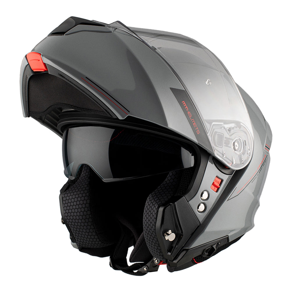 The MT Genesis is the latest update in the MT Helmets collection. The Genesis was designed with the sports and touring market in mind. Thanks to its many options, this helmet is your ideal travel partner for every ride. The motorcycle and scooter helmet is designed with the most modern and best techniques. All this to guarantee safety, protection and comfort during the entire ride. The helmet is equipped with the latest safety standards and meets the ECE-22.06 and DOT approval. This means that the helmet is permitted on public roads throughout Europe and the rest of the world as a motorcycle and scooter helmet. The helmet is equipped with a metal micrometic closure.