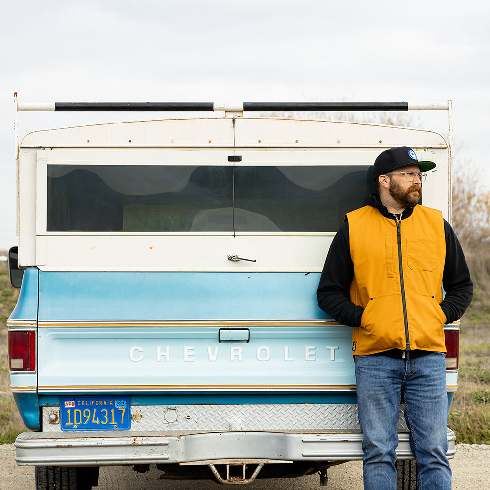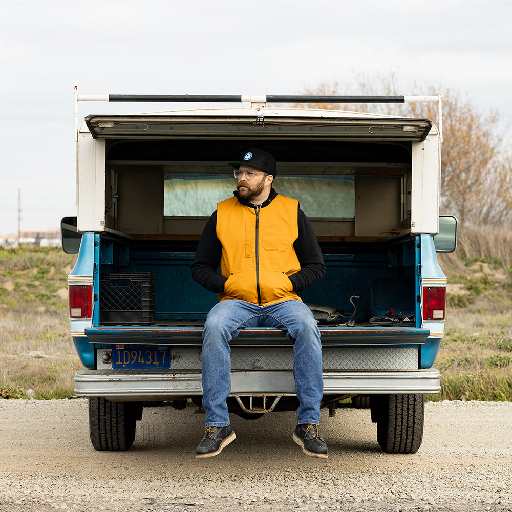Otto (6’2”, 185lb.) is wearing our Black 4-Speed vest in size Large over a Biltwell hoodie.